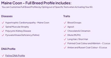 Also referred to as a DNA Fingerprint, a DNA Profile is unique for your animal and is used to verify parentage. The feline DNA Profile identifies 101 individual single nucleotide polymorphisms (SNPs). A DNA Profile allows you to verify any mating, an external stud service or any multiple sires. All Full Breed Profile requests include a DNA Profile. DNA profiling is a once off cost and is recommended for any breeding animal.